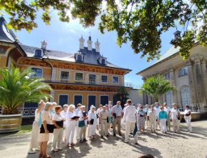 Es ist schon zu einer guten Tradition geworden, dass der Ostsächsische Chorverband an den Sommersonntagen die Chöre zum Singen im Schlosspark Pillnitz einlädt. Diese Konzerte bereiten uns wegen der entspannten Atmosphäre und der schönen Umgebung immer viel Freude. Das Wetter an diesem Sonntag versprach nichts Gutes, am Vormittag hatte es kräftig geregnet und auch beim Einsingen begann es zu tröpfeln, aber Sänger und Publikum ließen sich davon nicht abschrecken und tatsächlich kam für eine Stunde die Sonne heraus. Wir hatten ein buntgemischtes Programm mit deutschen und internationalen Volksliedern vorbereitet, so dass etwas wie Urlaubsfeeling bei der Reise um die Welt aufkam und Publikum und Sänger gleichermaßen gut gelaunt waren. Dazu trug auch die launige Moderation unseres Chorleiters bei.